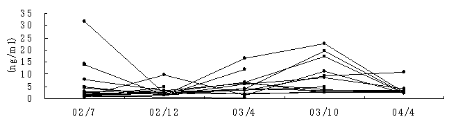 道内のBSE発生農場2戸から疑似患畜18頭を導入した。導入した疑似患畜は、いずれの牛においてもBSE発症を疑う異常な臨床症状は示さなかった。また、死亡あるいは鑑定殺を行った16頭は、ELISA法による延髄のBSE検査で陰性であった。ウエスタンブロット法による尿の解析では、すべての検体でプリオンは検出されなかった。血液および血清生化学分析は概ね正常な値で推移した(表1)。二次元電気泳動による血漿中蛋白質の解析は観察途中から出現するスポットが存在した。また、脳脊髄液の生化学検査および脳脊髄液S-100B蛋白質濃度においては一時的な変化を示す個体があったが、概ね安定して推移し、中枢神経障害を疑う所見は無かった(図1)。