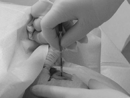 (1) 子牛の頭部標本を用い、接種方法を検討した。前頭骨はピンドリルにより容易に貫通することができ、また角間隆起から1cm鼻側、正中線から2cm右側の点はカテラン針を用いての脳幹部への穿刺が可能であった。