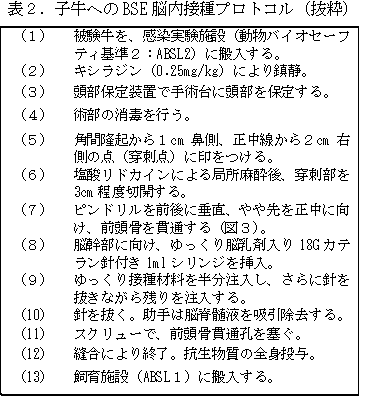 (3) これらの知見を体系化し、子牛へのBSE感染脳乳剤脳内接種法プロトコルを作成した(表3)。