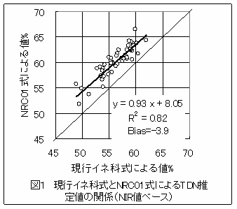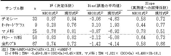 2) NRC01式ではチモシー主体草において、現行のTDN推定値より約4ポイント高くなる。
