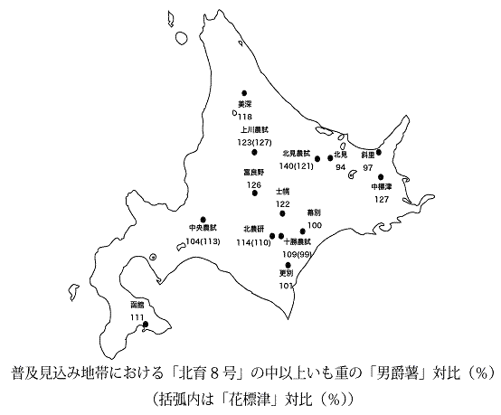 「北育8号」は、疫病圃場抵抗性が“強”であり、上いも平均一個重がほぼ「男爵薯」並であるため規格内いも重が改善されている。塊茎の外観品質も「花標津」より改善されており、枯凋期もやや早い。また食味が優れ、コロッケ適性も持つ。「北育8号」を優良品種に採用することで、疫病防除を省くことができ、減農薬栽培や有機栽培において、「男爵薯」等の一般品種のように減収することなく高品質で効率的な生産が可能となり、コロッケ適性を生かすことで新たな販路の開拓も可能となるため、多くの生産者に受け入れられることが期待される。その結果、食の安全に関心の高い消費者のニーズにも応えることが出来るものと期待される。