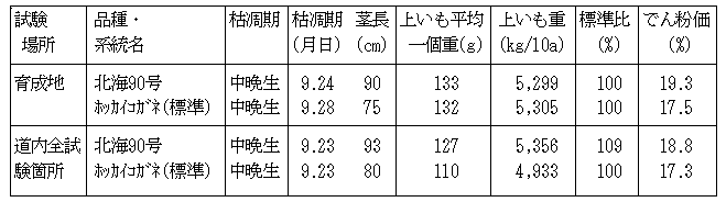 枯凋期は「ホッカイコガネ」並の“中晩生”で、茎長は「ホッカイコガネ」に比べてやや長く、平均一個重は「ホッカイコガネ」並で大粒である(表1)。収量は「ホッカイコガネ」並〜多く、でん粉価は「ホッカイコガネ」より高い(表1)。