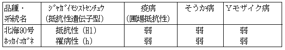 病害虫抵抗性では、ジャガイモシストセンチュウに対し抵抗性を持ち(表3)、汚染地での栽培では同線虫の密度を低減し、未発生地では汚染の拡大を未然に防ぐ効果がある。また、疫病(圃場抵抗性)、そうか病、Yモザイク病に対する抵抗性は「ホッカイコガネ」と同じ“弱”である(表3)。