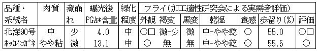 フライ実需者コメント北海90号:褐変は加工法による対処可能。表面の硬さが良い。味が異なるので新しい商品として考え、新しい客の開拓にも繋げたい。 |