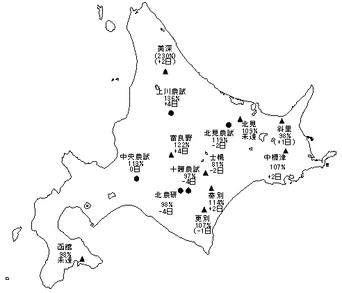 「ホッカイコガネ」に対する収量比(%)と枯凋期差(日)