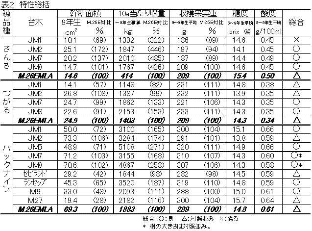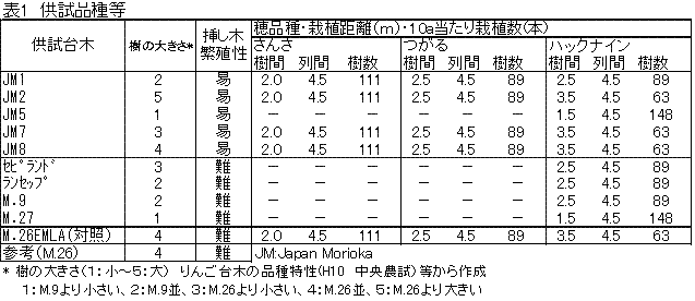 また、「JM7」「JM8」は樹の大きさは対照並であるが、収量性が勝ることから有望である。栽植距離はM.26台と同程度でよいと考えられる。