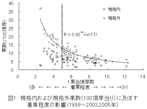 2)着果程度を多くすると規格内果数はやや増加する程度なのに対し、規格外果数は着果程度が多くなると増加し、1果当頂芽数でみると5頂芽前後から増加の程度は大きくなった。
