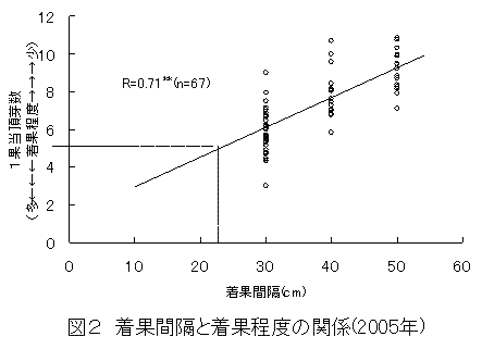 5)1果当頂芽数と着果間隔の関係を検討した結果、着果間隔25cmが摘果時の目安として利用可能である(図2)。