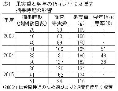 1)満開後50日の摘果では同30日および40日の摘果に比べ果実重が小さくなり、頂花芽率も低下し、摘果時期として遅かった(表1)。