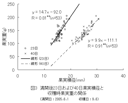 2)満開後23日の果実横径と収穫時果実重には高い正の相関が認められるが、満開後40日や50日に比べるとばらつきがやや大きくなり、回帰直線の傾きが急になったことから、極端