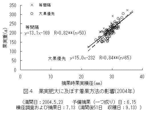 3)以上の結果から、摘果時期は満開後30日〜40日が適当である。摘果時の果実横径と収穫時果実重に高い相関が認められたことから、摘果時点での果実の大きさが収穫時の果実