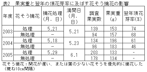1)花そう摘花の果実肥大に対する効果はそれほど大きくないが、頂花芽率が高くなり隔年結果の軽減効果が認められた(表2)。花そう摘花は、時期的に他の作業との競合が少なく、
