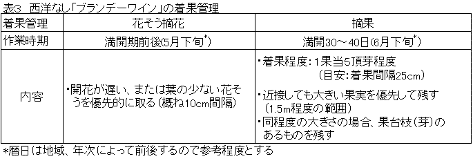 以上の結果をもとに、西洋なし「ブランデーワイン」の着果管理について表3のとおり取りまとめた。