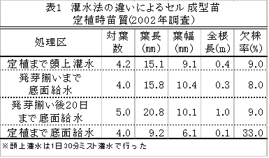 5.4、固相率9.6%、有効水分保持量28.8ml/100mlに準じた特性を持つ培土が適当であった。発芽揃い後20日までを目安に底面給水から頭上灌水に変更すると、育苗時の欠株率を低く