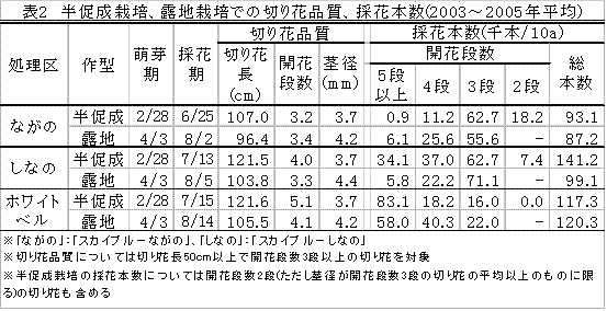 あった(表2)。半促成栽培の採花時期は切り花単価が高く、定植3年目と4年目の所得は露地栽培より高くなった。
