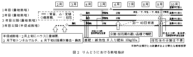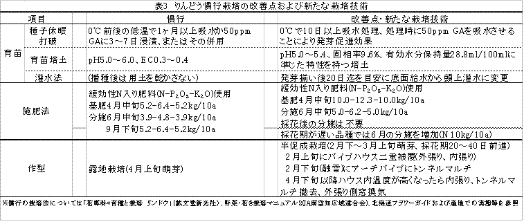 以上の結果から慣行との改善点および新たな栽培技術を組み入れたりんどうの栽培指針を作成した(表3、図1、図2)。