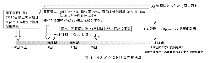 播種前に0℃、10日以上吸水処理を行い、播種後覆土をせずに管理することにより発芽率が向上した。吸水時の50ppm GA処理により発芽促進効果がみられた。育苗にはpH5.0〜