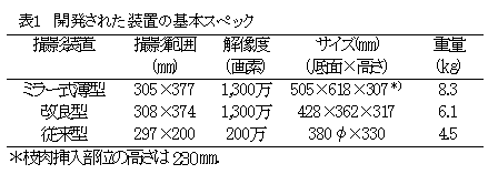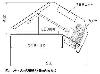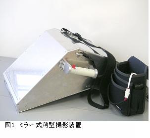 1)-② ミラーを用いた機構の採用により、改良型撮影装置の全高を約23cm(ただし枝肉挿入部のみ)に薄くした実用型撮影装置(ミラー式薄型撮影装置)を開発した。