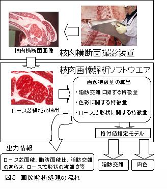 枝肉横断面撮影装置と画像解析ソフトウエアからなる牛枝肉品質計測システムを開発し、その情報を生産者にフィードバックする体制を構築した。本システムは、より客観的で精細な品質情報を得ることを可能とし、育種改良や肥育牛生産の現場等において、品質や技術向上の有効な手段となる。