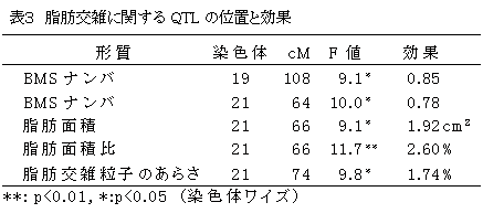 3)-② 脂肪交雑に関するQTL(量的形質遺伝子座)解析の結果、BMS ナンバと関連の高い脂肪面積比において高度に有意なQTLが検出され、QTL解析における有効性が示された