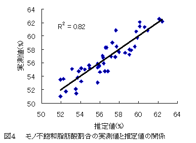 3)-③ 高精細枝肉画像を利用した精細な解析により、牛肉の美味しさに関係のある筋肉内脂肪中のモノ不飽和脂肪酸割合を推定できる可能性が示された(図4)。