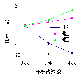 2)-(1) 分娩後4週目までの乳量は、L区からH区へと有意に増加した(表1)。L区では体重が著しく減少し、H区では4週間で15kg以上の体重増加が見られた(図2)。