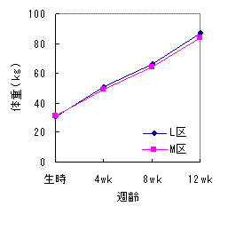 M区では体重変化が小さかった。したがって本試験の結果では、L区やH区と比較してM区が適当である。