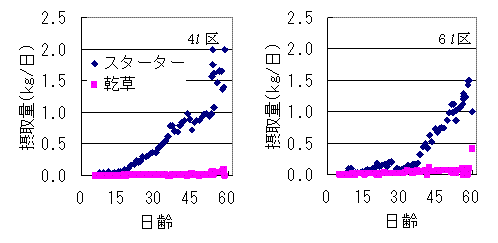 3)自動哺乳装置による代用乳の給与量を4 l から6 l へ高めることにより子牛のスターター摂取は2週間程度遅れることが示された(図4)。