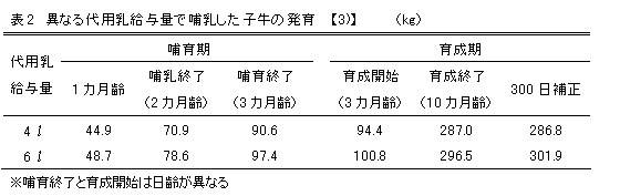 しかし、離乳時のスターター摂取量は1kgを超えており、十分離乳可能な量に達していた。育成後の300日齢補正体重は、6l給与で哺乳した牛の方が大きかった(表2)。
