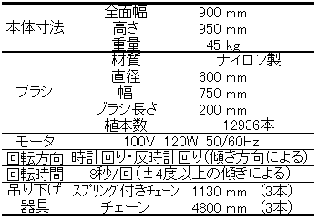 本試験で用いた自動牛体ブラシは、回転軸付きモータと円筒型ブラシから成り、幅900mm、高さ950mm、重量45kgである。ブラシはナイロン製(長さ200mm)で、牛がブラシに接触して4