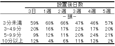3)1回あたりの利用時間は3分以下が最も多く、60%〜80%の牛は5分以内の利用であるが、10分以上の出現も10%前後見られた(表3)。
