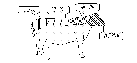 5)牛の利用部位は尻(38%)が最も高く、続いて頭(30%)の利用が多かった(図3)。
