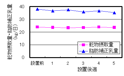 7)設置前後の乾物摂取量および脂肪補正乳量は変化しなかった(図5)。