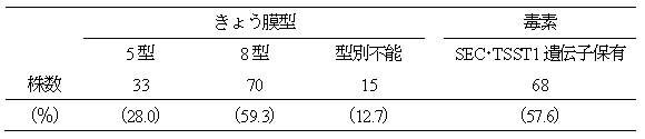 表1 分離したS.aureus 118株のきょう膜型と毒素遺伝子保有
