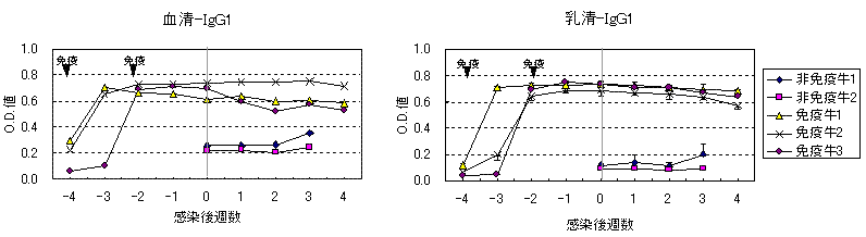 図2 mSEC免疫牛、非免疫牛における血清および乳清中のIgG1抗体価の推移