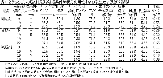 1)破砕処理とうもろこしサイレージは熟期により養分利用性が異なることから、飼料特性を考慮した飼料設計を行う必要がある。