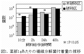 約2倍になった。黄熟期の破砕処理CSの茎部には繊維分解菌が迅速に付着し、NDF消化率向上に関与していると考えられた(図1)。