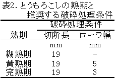 黄熟期および完熟期では破砕処理CS給与時に乳量および体重増加量が多かった。 これらから、とうもろこしの熟期ごとに推奨する破砕処理条件を表2に示した。
