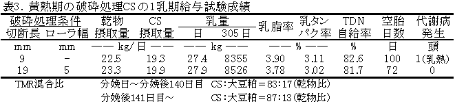 2) 黄熟期の破砕処理CS(切断長19mm・ローラ幅5mm)を1乳期にわたり飽食給与すると(CS現物摂取量45〜55kg/日)、TDN自給率82%で8500kgの乳生産が得られた(表3)。