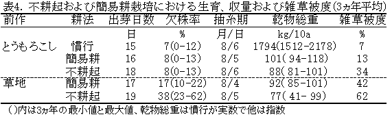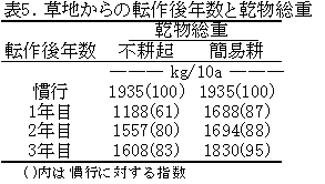 下する場合があり不安定であったことから、不耕起栽培は避けるべきと考えられた(表4)。草地跡では連作することで、収量は増加した(表5)。
