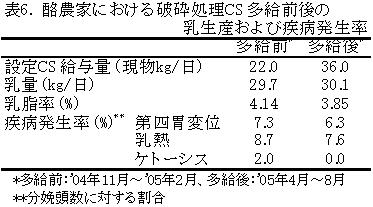 4)-(1) 十勝管内の酪農家で、破砕処理CS(切断長17mm・ローラ幅3.5mm)を多給すると(現物給与量36kg)、多給前後の乳量に差はなく、第四胃変位の発生率にも差はなかった(表6)。