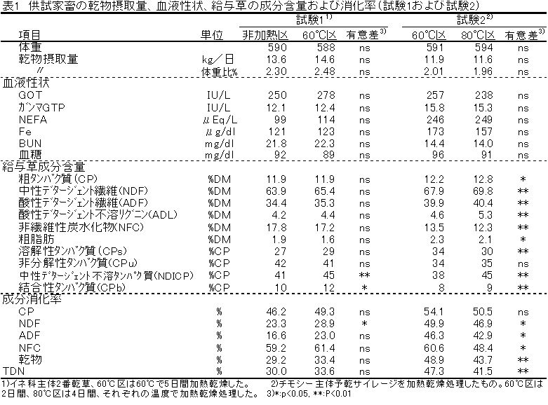 1-1) 非加熱区と60℃区の比較において乾物摂取量、血液成分に差は認められなかった。成分含量は60℃区では中性デタージェント不溶タンパク質(NDICP)含量の上昇が認められ