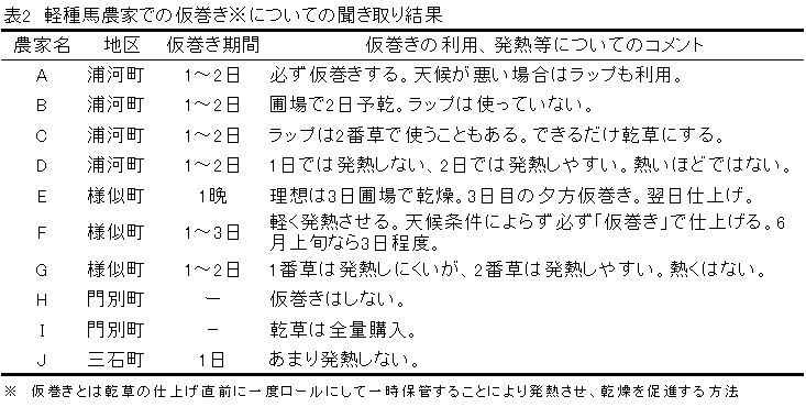 ルにして乾草を仕上げるというものであった(表2)。既往の報告からロール後1〜3日程度の放置では60℃以下の発熱と推測されること、また、農家からの聞き取りでは触れて熱い