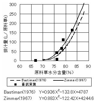 の推定式を用いると、排汁量は水分含量75,80,85%でそれぞれ20,90,200L/原料草t程度と推定された(図1)。