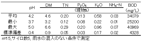 ① 畜試サイロにおける排汁原液の成分は平均でpH;4.2、全窒素;0.20%、リン酸(P2O5);0.13%、カリウム(K2O);0.58%、BOD;34000mg/Lであり、肥料成分や汚濁物質を多く含んでいた