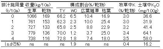 表5 2番草に対する排汁施用が収量、草種構および土壌中K2Oに及ぼす影響(2004年更新3年目草地)