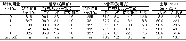 表4 2番草に対する排汁施用が収量、草種構成、牧草中K、土壌中K2Oに及ぼす影響(2003年更新2年目草地)