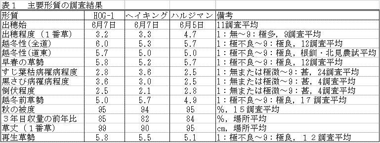 オーチャードグラス「HOG-1」は晩生に属し、越冬性、1,2番草の収量に優れる安定多収な品種である。採草および放牧利用として北海道全域で利用できる。