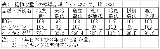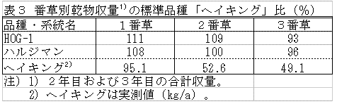 2)収量性:「ヘイキング」より優れる。番草別にみると1番草、2番草は優れ、3番草は劣る。3年目収量の低下は「ヘイキング」と同程度である。