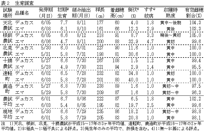 1) 熟期:絹糸抽出期は1日遅く、収穫時熟度および雌穂乾物率は並である。熟期は早生の早に属する。